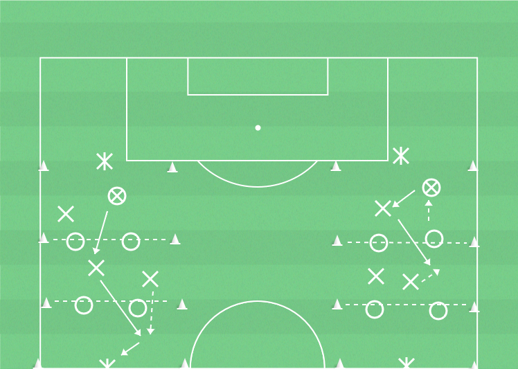 Spelbarhet bakom lucka i försvarslinje utmanar försvararna att hålla spelet framför sig. Kontring genom att helst spela framåt och flytta fram en linje.