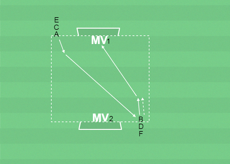 D passar bollen till A som tar emot och skjuter mot målvakt 2.