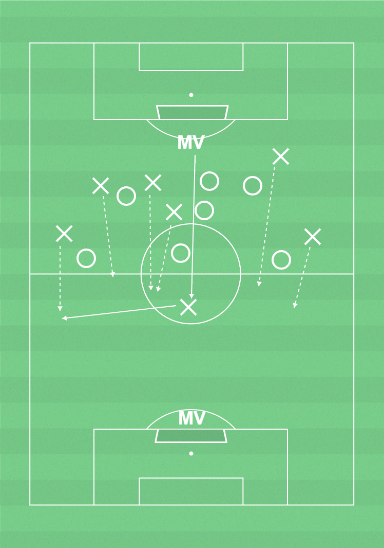 Mv1 spelar ut bollen till motsatt planhalva där det blir spel 7 mot 6.