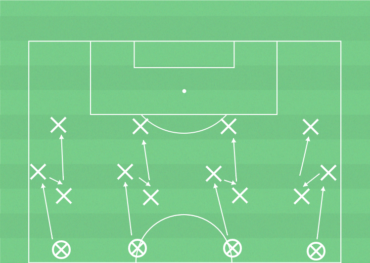 Behålla bollen inom laget genom djupledsspel.