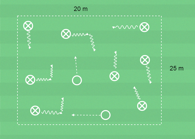 10 barn, yta 25 x 20 meter, bollar och koner.