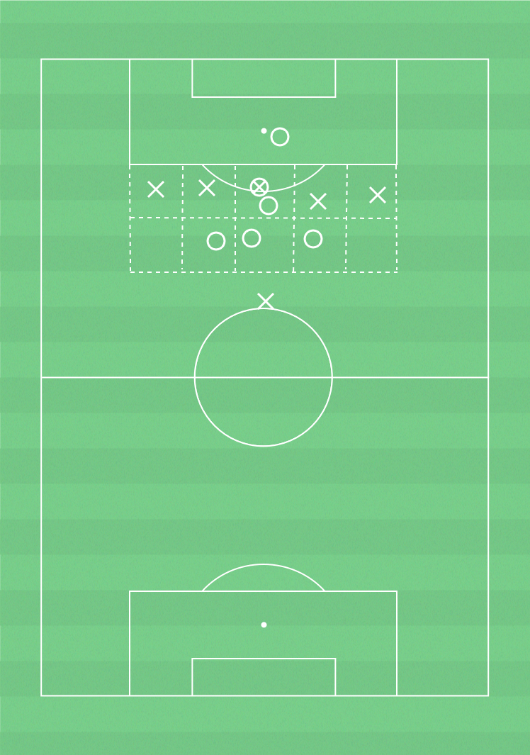 - Flytta över eller centrera så att de tre korridorerna närmast bollen täcks (pressande och täckande spelare i korridoren där bollen är) och de två korridorna längst ifrån bollen lämnas tomma.