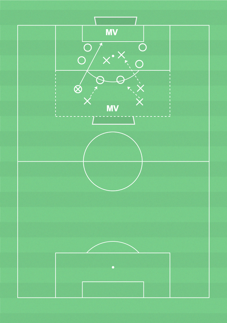 Uppgiften för det övertaliga laget är att avsluta och göra mål från egen planhalva samt återerövra bollen vid bollförlust. Efter avslut får de springa in på offensiv planhalva för att återerövra bollen där.