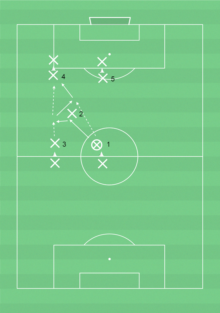 X1 och X3 följer bollen till motsatt sida och övningen vänder.