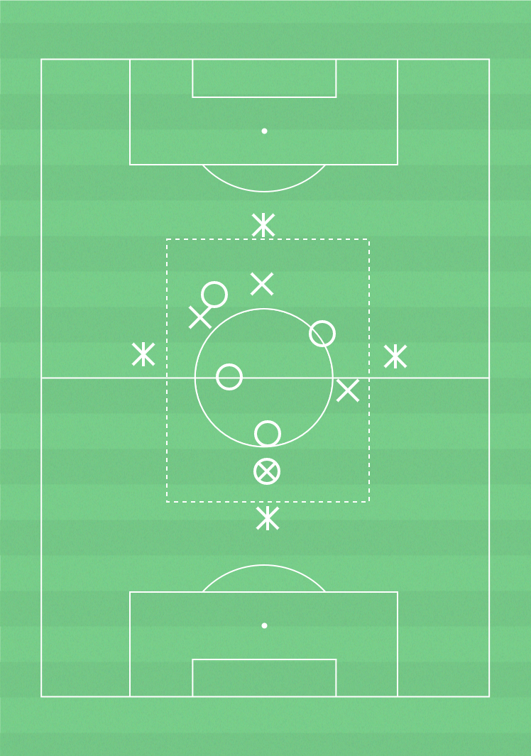 12 spelare, spelplan 40 x 20 meter, bollar, koner och västar.