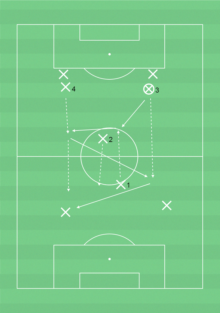 X3 passar till mötande forward – X1 – som gör ett tillbakaspel till X4.