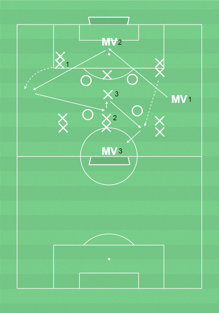 X3 spelar bollen i djupled till X4 som löper in bakom motståndarnas backlinje och avslutar mot Mv3.