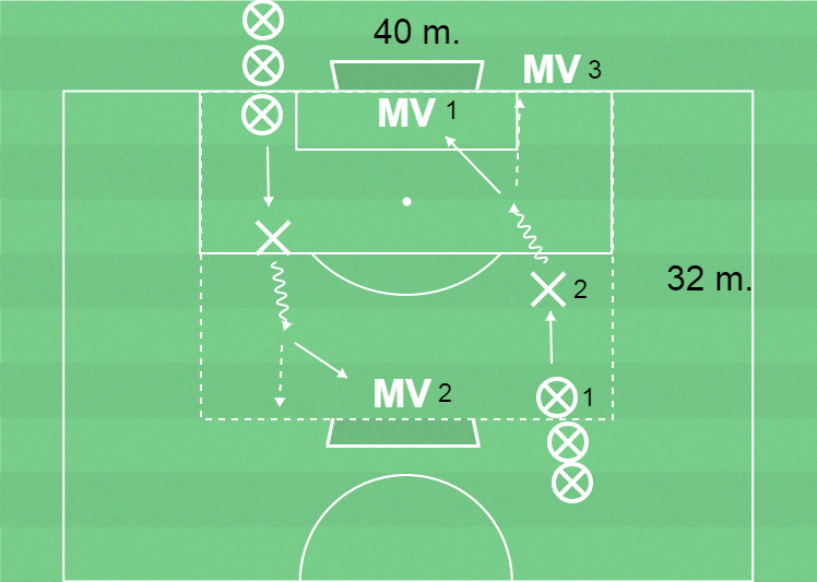 3 målvakter, 8 utespelare, yta 32 x 40 meter med 2 mål, bollar och koner.
