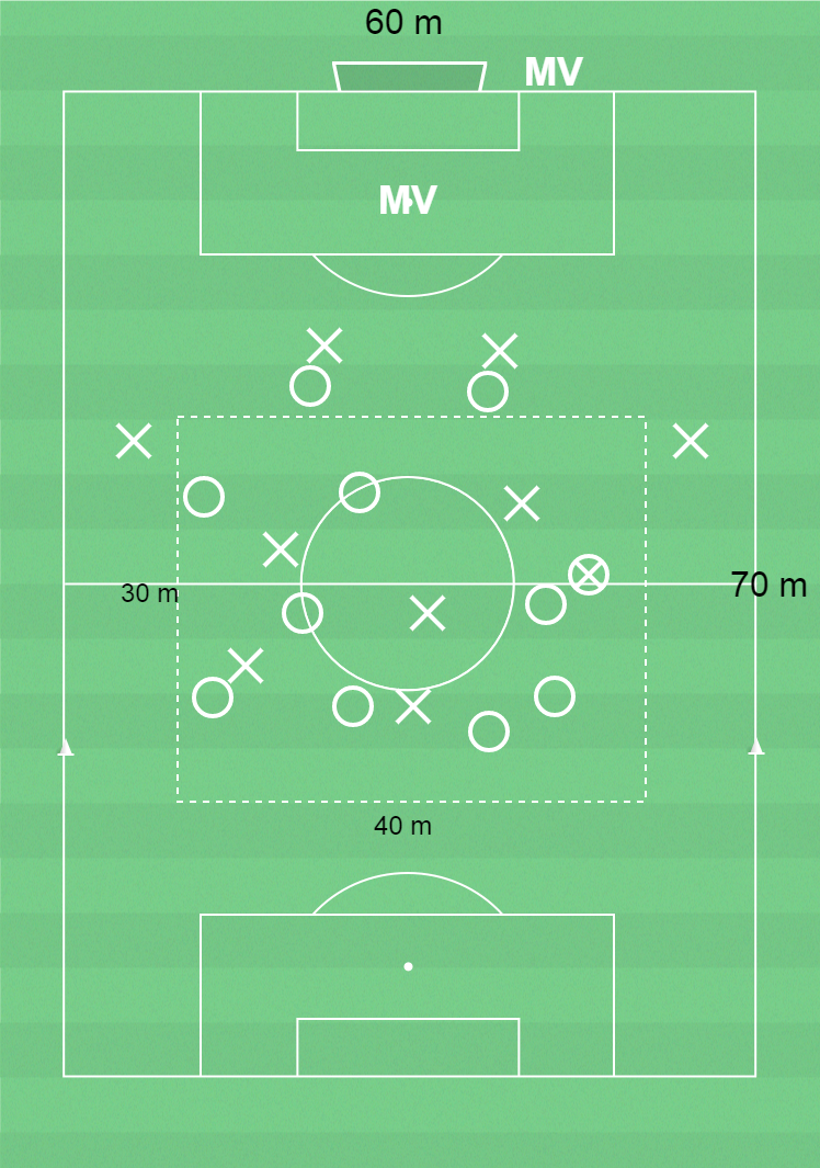 2 målvakter, 20 utespelare, spelplan 70 x 60 meter med 1 mål, bollar, koner och västar.