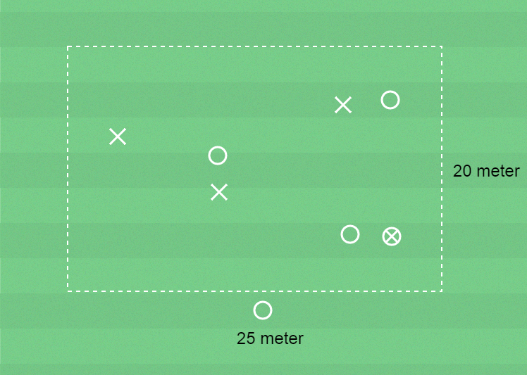 8 spelare, yta 25 x 20 meter, bollar, koner och västar.