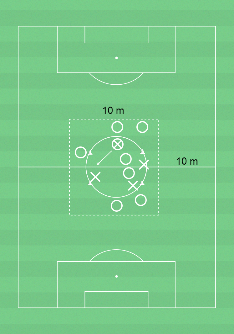 Lag X ställer om direkt och försöker återerövra bollen i den stora ytan. Därefter börjar övningen om.