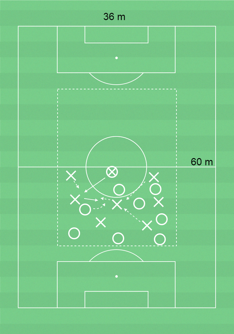 16 spelare, spelplan 60 x 36 meter, bollar, koner och västar.