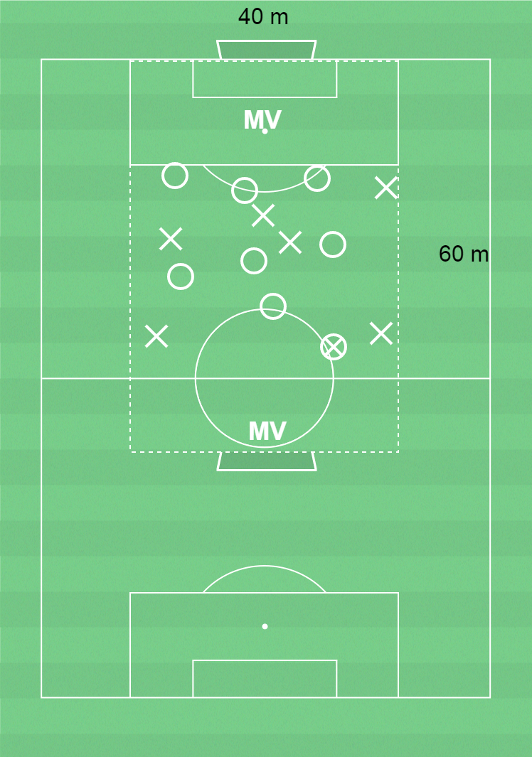 2 målvakter, 14 utespelare, spelplan 60 x 40 meter med 2 mål, bollar, koner och västar.