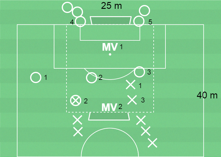 När det anfallande laget avslutat eller det försvarande laget brutit kommer O1 in och O1, O4 och O5 kontrar mot X2, X3 och Mv2.