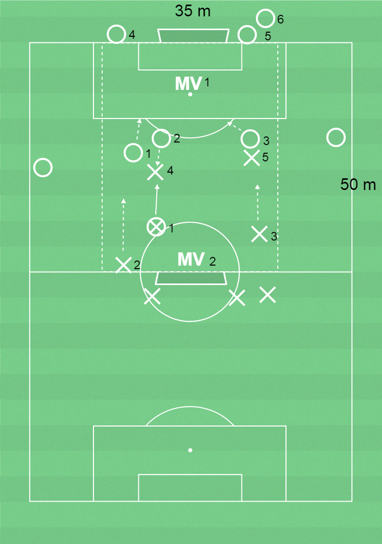 2 målvakter, 16 utespelare, spelplan 50 x 35 meter med 2 mål, bollar, koner och västar.