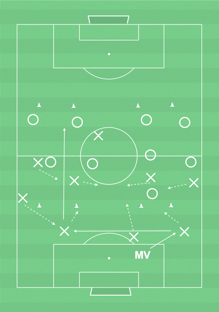 Det andra laget passar runt bollen, spelar över den och placerar sig sedan i sin försvarsformation.