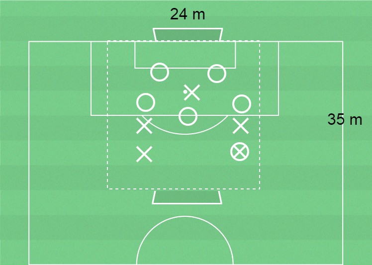 10 spelare, spelplan 35 x 24 meter med 2 mål, bollar, koner och västar.