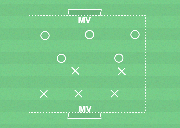 2 målvakter, 10 utespelare, spelplan 45 x 35 m med 2 mål, bollar, koner och västar.