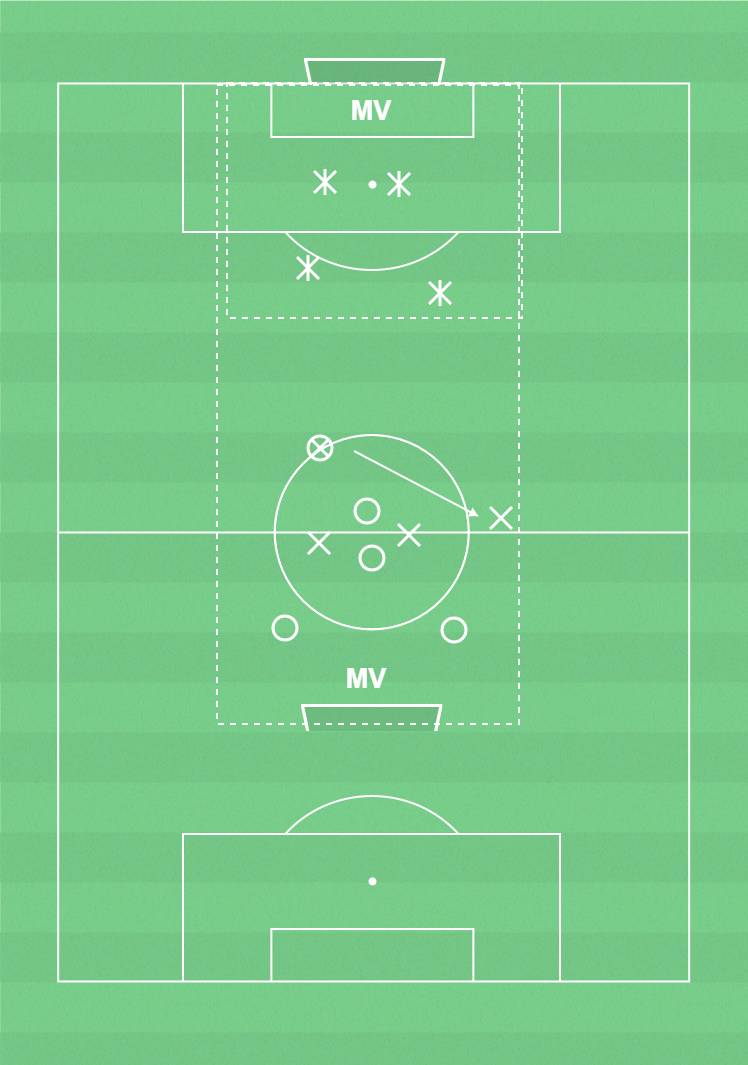 När lag O bryter ska spelarna ställa om till anfallsspel och snabbt spela sig in i den fria mittzonen.