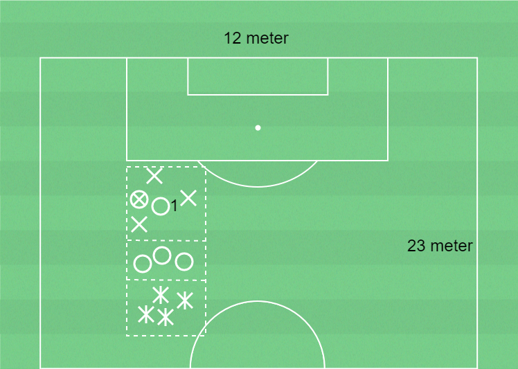 Lag X bygger upp spelet i den ena ändzonen, och alla spelarna måste röra bollen innan den spelas över till lag . O1 pressar.