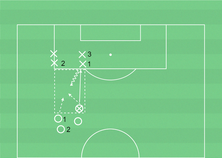 X1 ska försöka passera den ursprungliga bollhållarens och O1:s mållinje med bollen under kontroll. Försvarsspelaren som är närmast bollhållaren pressar och den andre ger understöd.