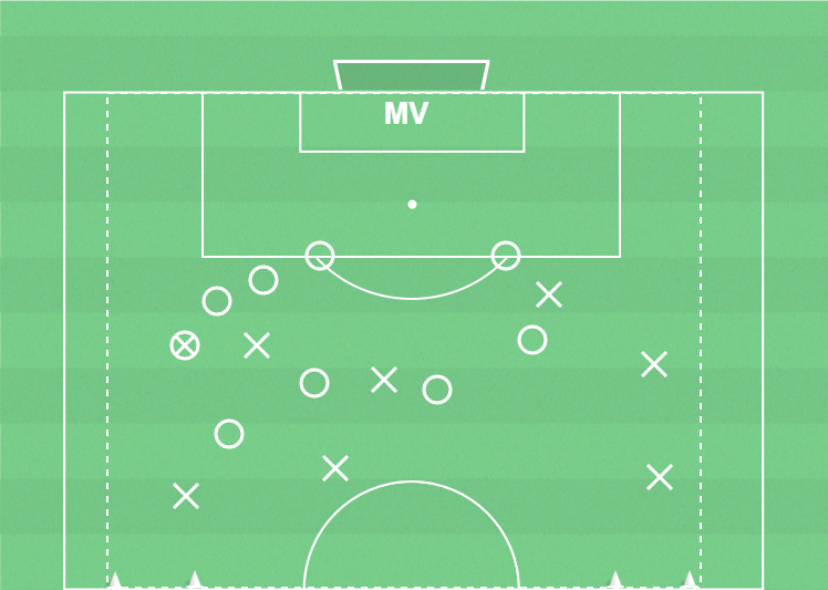 Det anfallande laget har 8 spelare och det försvarande laget 8 spelare plus målvakt.