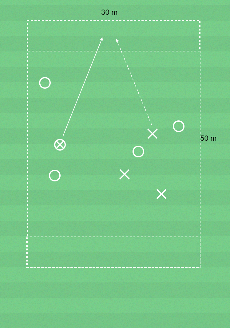 8 spelare, spelplan 50 x 30 meter, bollar, koner och västar.