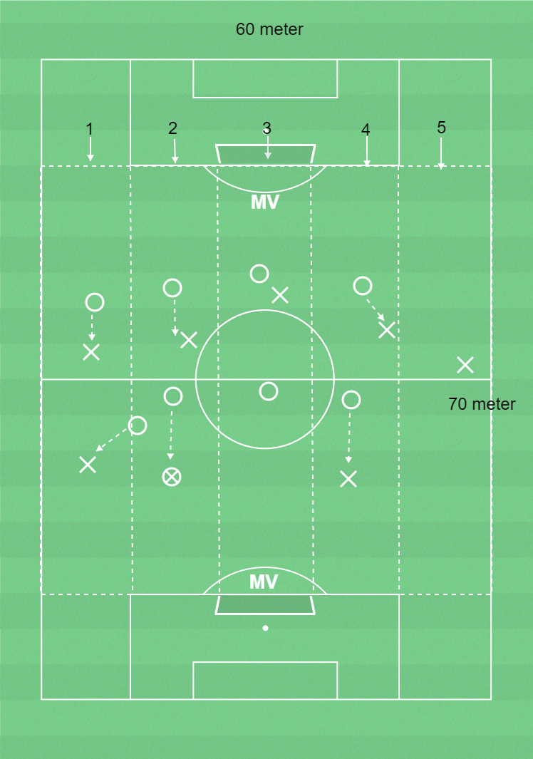 2 målvakter, 16 utespelare, spelplan 70 x 60 meter, bollar, koner och västar.