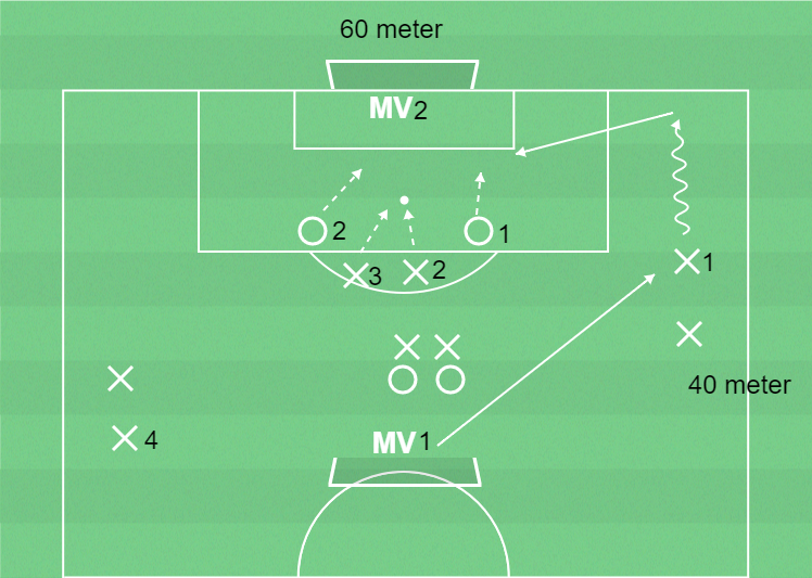 Mv2 kastar ut bollen till X4 som slår inlägg mot andra målet där 5 andra spelare agerar.