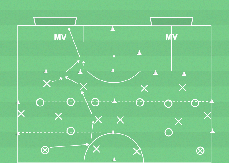 Se en passningslinje till rättvänd mf. Backar och mf, försök bli rättvända och leta efter passning genom om vi kan. Försvarande mf och fwd täcker en linje.