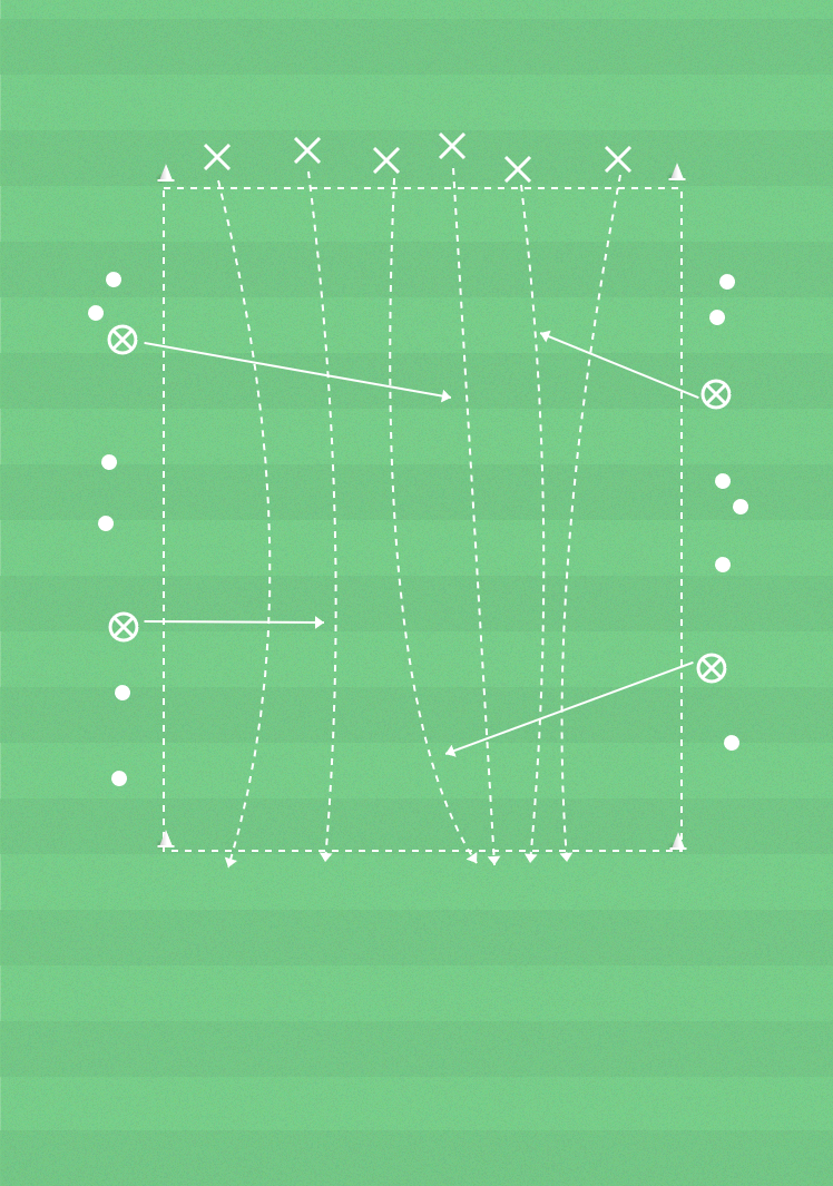 Alla spelare på ena kortsidan. Ledare med bollar längs med långsidorna. På signal ska spelarna springa över till den andra kortsidan utan att bli träffad av bollarna. Ledarna försöker pricka spelarna när de springer över. Ledarna får bara använda bredsidan och träff räknas bara från knät och neråt.