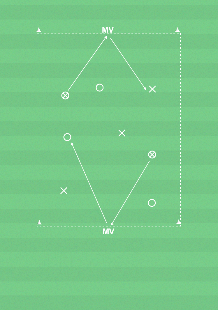 En spelare agerar målvakt på båda kortsidorna. Övriga spelare delas upp i två lag med lika många i varje. Bollen spelas inom laget från kortsida till kortsida. Målvakterna är med båda lagen och passar till den färg som bollen kommit ifrån.