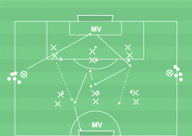 Skott mot fallande backlinje. Instick bakom stötande back. Cutback mot låg centrerad backlinje. Diagonala kontringspassningar. Maxlöpning in bakom backlinje.