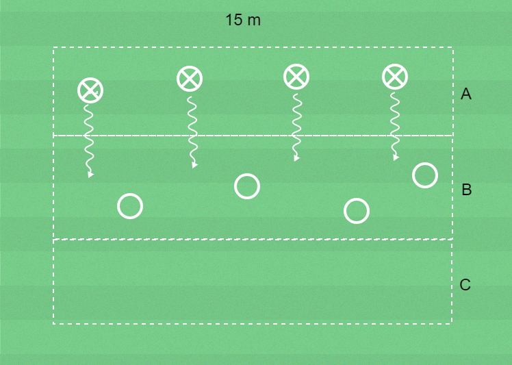 Dela in barnen i 2 lag med 4 i varje och ytan i tre zoner: A, B och C. Alla i blått lag hämtar var sin boll i zon A och driver in bollarna i zon B. Rött lag ska erövra bollarna i zon B och driva in dem i zon C.