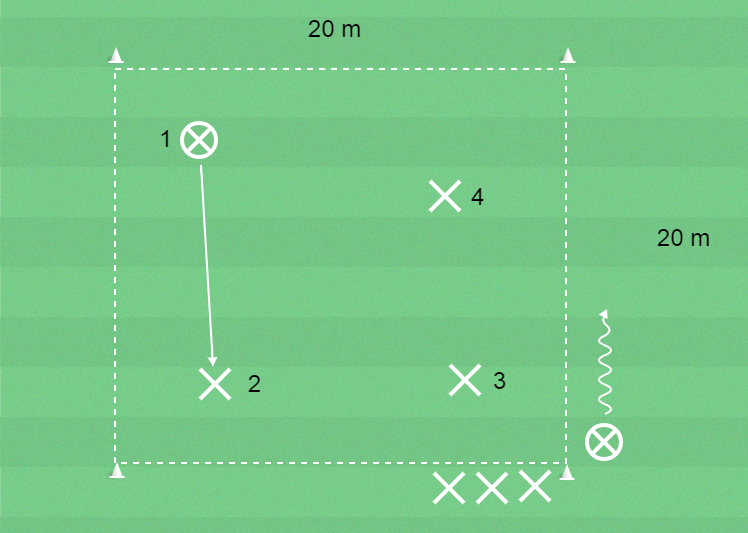 Dela in barnen i 2 lag och numrera dem från 1 till 4. Barnen i ”innelaget” passar bollen till varandra i nummerordning och med 2 tillslag.