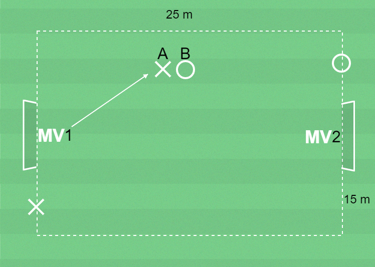 Mv. 1 rullar ut bollen till A som markeras av B.