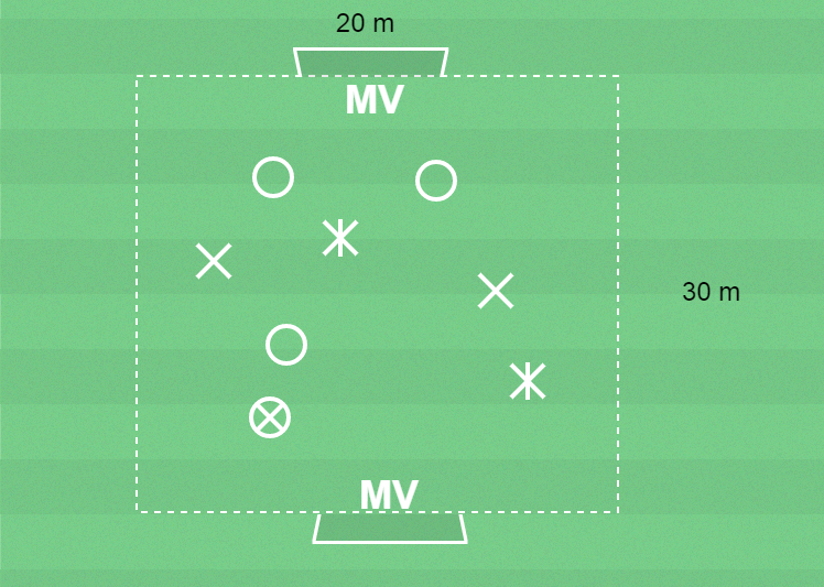 Spel 3 mot 3 med målvakter + 2 spelare som alltid tillhör det bollhållande laget.