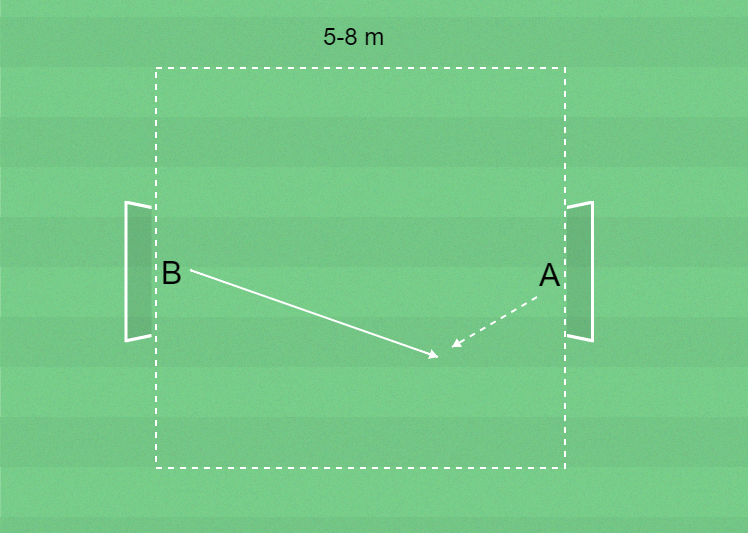 A står på knä med 90 grader i knäleden och med rak rygg. B skjuter bollen vid sidan om A.