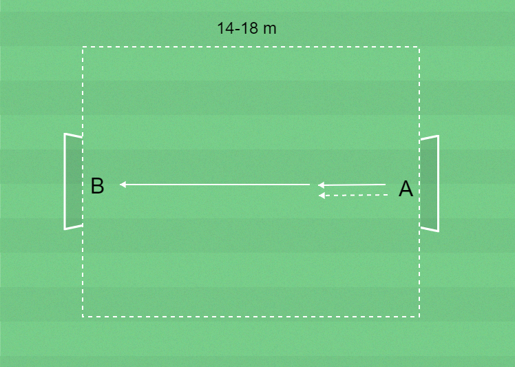 Spelare A spelar fram bollen och skjuter mot B. B spelar fram bollen och skjuter mot A.