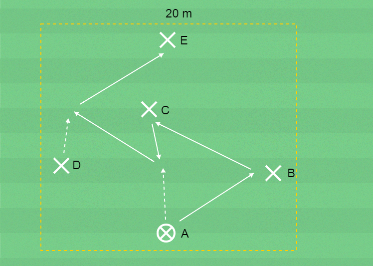 C tar emot bollen och passar till A som tar emot och passar till D.