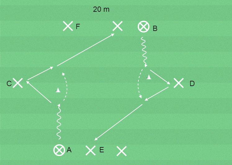 A och B utmanar konerna, tänkta motspelare, och passar till väggspelarna C och D. Väggspelarna passar direkt till A och B som spelar vidare till E och F.