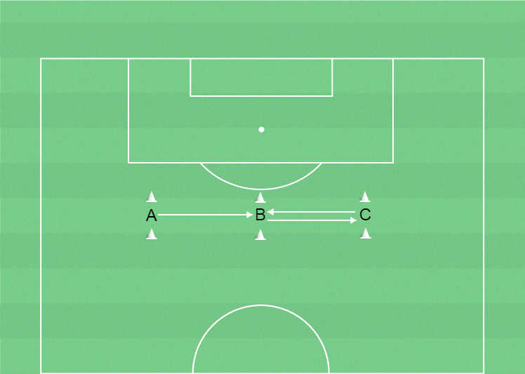 3 barn, 3 konmål avstånd 10–15 m mellan de yttre målen och bollar.