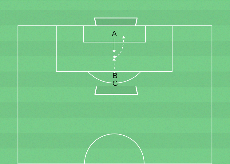 C kastar bollen mot A som hoppar upp och fångar den.