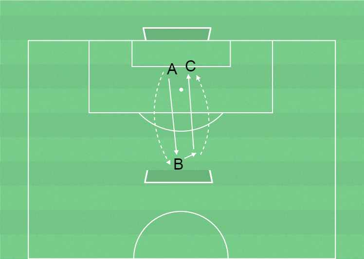 C passar till B som tar emot och passar tillbaka till C.