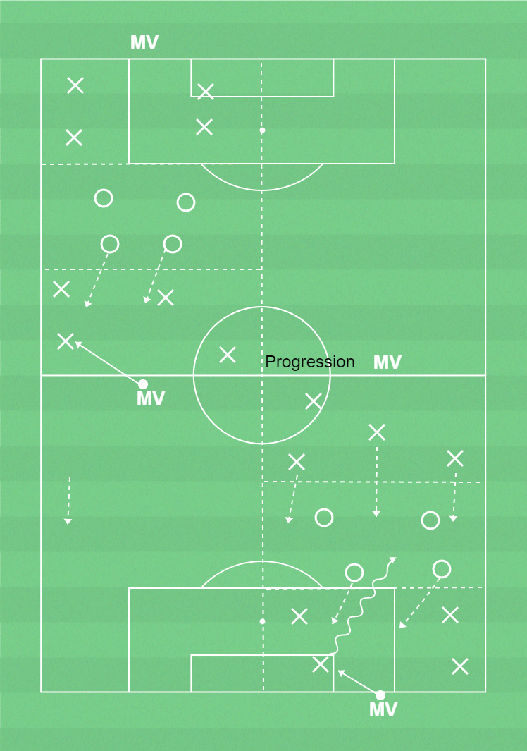 3 lag med lika många i varje. 1 MV på varje kortsida. Planen indelad i tredjedelar. 8+2 anfallare mot 4 försvarare. 4 anfallare + MV i första och sista 1/3. Uppgiften är att spela bollen från den första till den sista 1/3. 2 försvarare får gå in och pressa när MV startar spelet och de 2 andra två försvarar den centrala 1/3 och pressar åt andra hållet. Vid bollvinst ska försvarare nå MV med passning och anfallarna återerövra. Byt uppgifter efter viss tid.