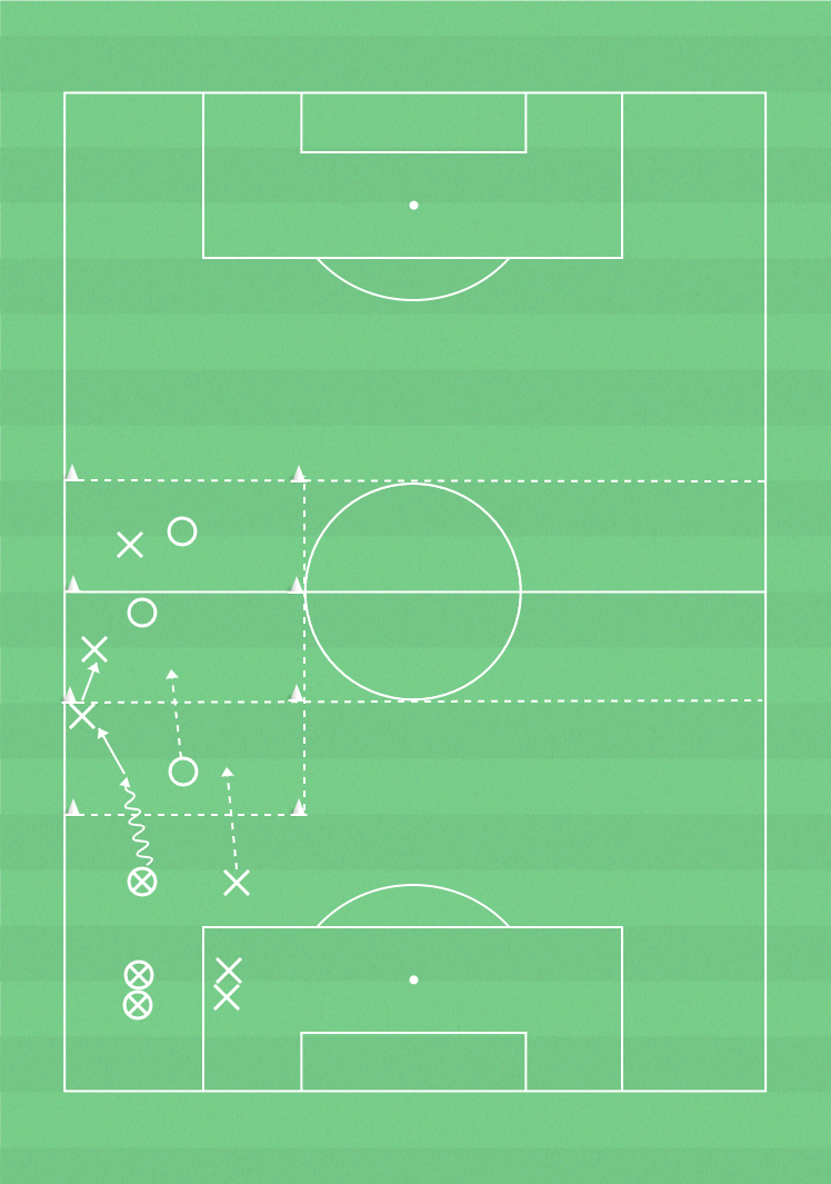 3 zoner med 1 försvarare och 1 anfallare i varje. 2 spelare med en boll tar sig in i första ytan och anfaller 3 mot 1. Om anfallarna tagit sig in i nästa yta får både anfallare och försvarare ta sig in i nästa yta. Anfallarna ska försöka ta sig igenom alla 3 ytor. När försvarare blivit passerad gäller det att komma på försvarssida i nästa yta för att jämna ut det numerära underläget. Om försvararna vinner bollen ska de spela upp bollen till till ytan bakom zonerna. Laget som tappat bollen kan återerövra bollen. Byt uppgifter efter viss tid.