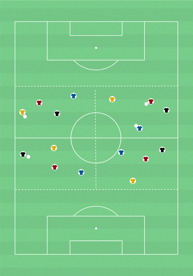 En från varje fyra i resp kvadrat. Passa bollen inom laget.
