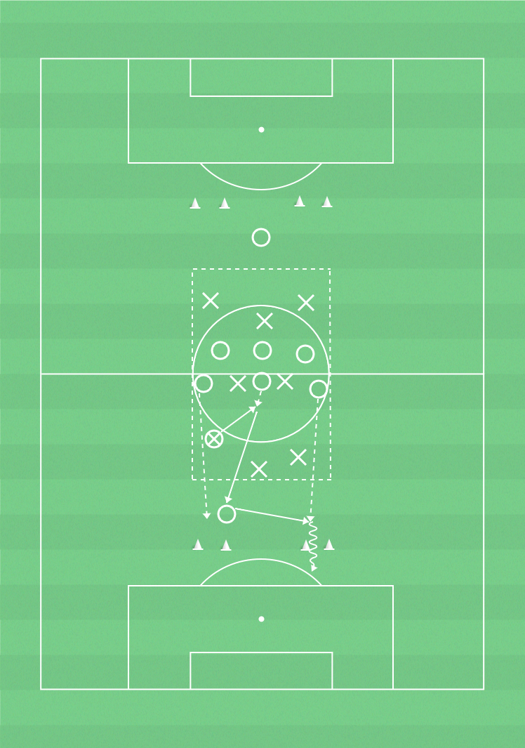 2 lag med lika många i varje. Försvarande lag har en spelare bakom varje kortsida och är därmed i numerärt underläge i ytan. Anfallande lag försöker att hålla bollen inom laget. När försvarande lag vinner bollen ska de så snabbt som möjligt spela bollen till en av spelarna bakom kortsidorna och göra mål genom att driva genom något av konmålen. Spelaren på kortsidan får inte göra mål själv utan måste spela en medspelare. Anfallande lag får bara försvara innanför ytan efter bollförlust. Byt spelare på kortsidan efter viss tid och försvarande lag efter 3 minuter.