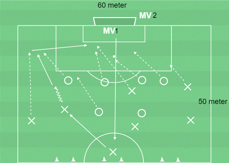 Spel 7 mot 6 plus målvakt. Mv1 spelar bollen till en central mittfältare i lag X och lag O gör uppflyttning. Lag X ska avsluta efter inlägg – sena, tidiga och cut backs. Lag O försvarar mot inlägg. Om lag O erövrar bollen ska man göra mål i konmålen.