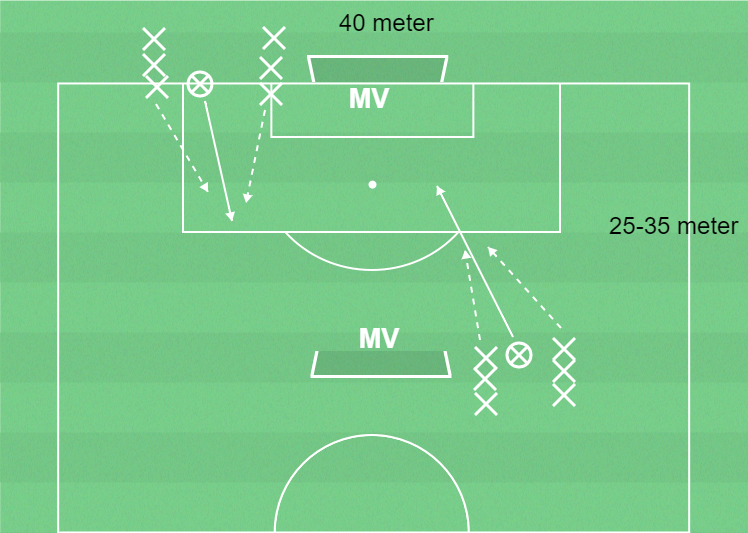 2 målvakter, 2–16 utespelare, yta 25-35 x 40 meter med 2 mål, bollar, koner och västar.
